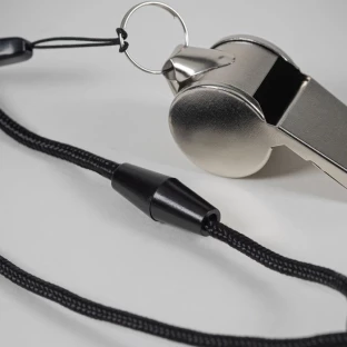 Metalowy gwizdek przymocowany do smyczy z klamrą bezpieczeństwa.